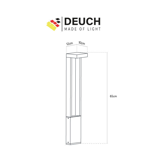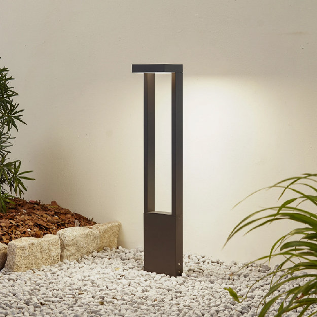 Bolardo moderno con LED integrado, diseño minimalista de líneas rectas, ideal para resaltar jardines deck y caminos.